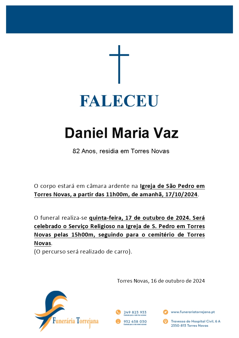 Funeral: Igreja de São Pedro Torres Novas – 15h00m (17/10/2024)