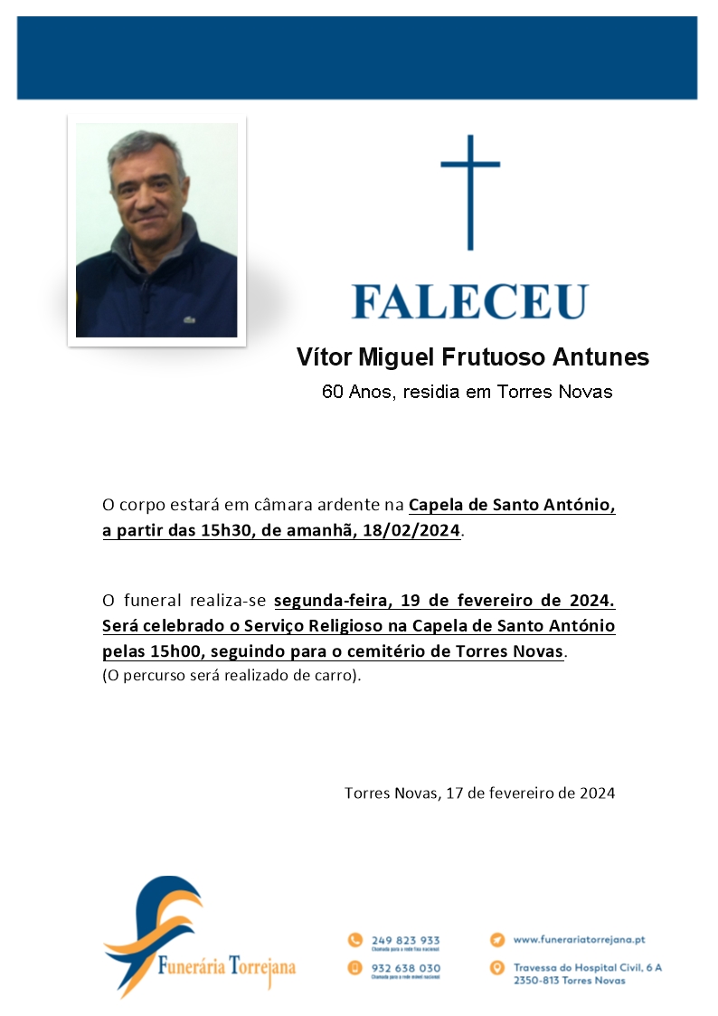 Funeral: 2ª feira, Capela de Santo António – 15h00m